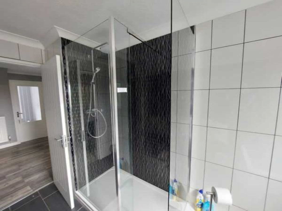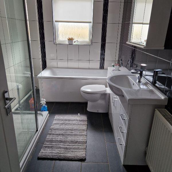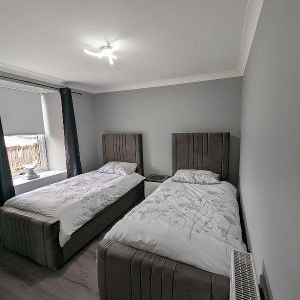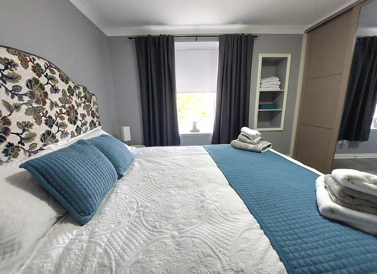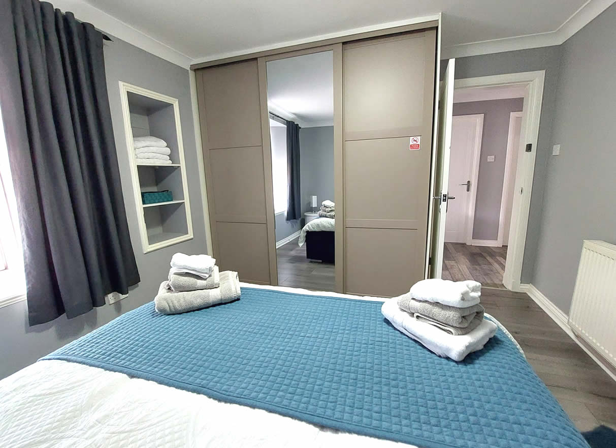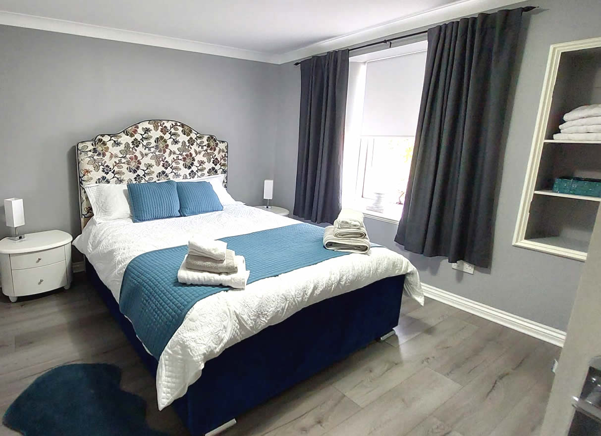The master bedroom has a kingsize bed with high quality mattress and bedding for a comfortable night’s sleep. There are also bedside cabinets with sockets and charging facilities.
