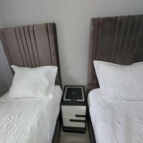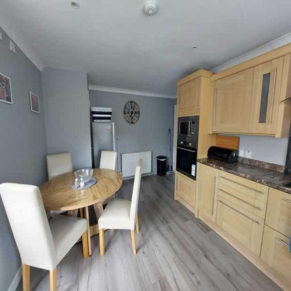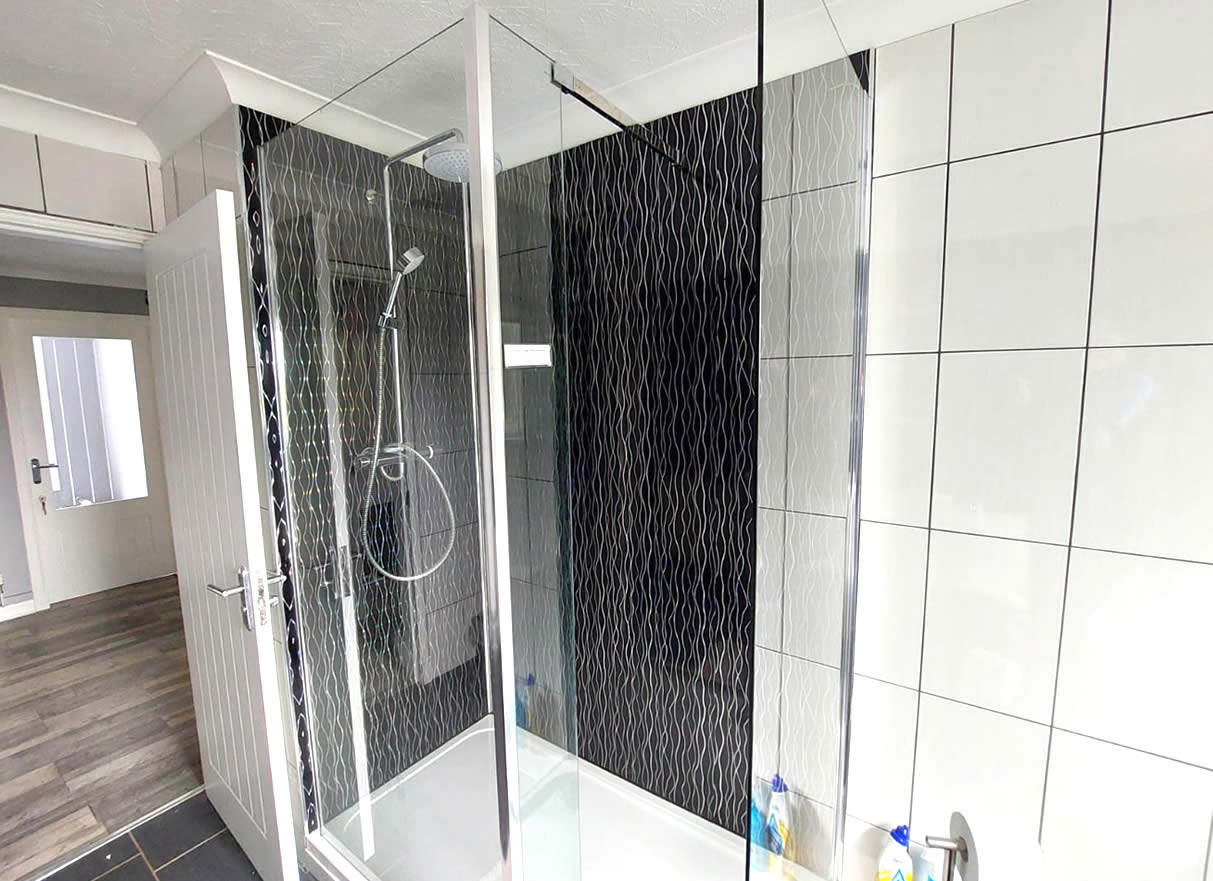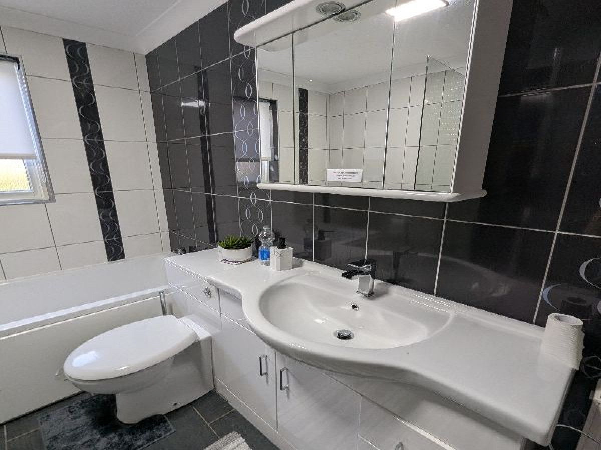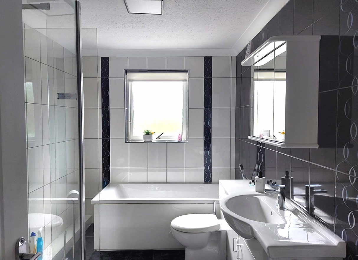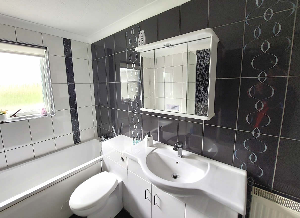 Modern, tiled bathroom with bath and shower. The bath also has a shower head. There is storage with the bathroom cabinet also having a shaver charging socket